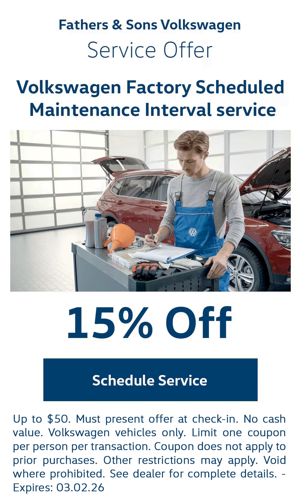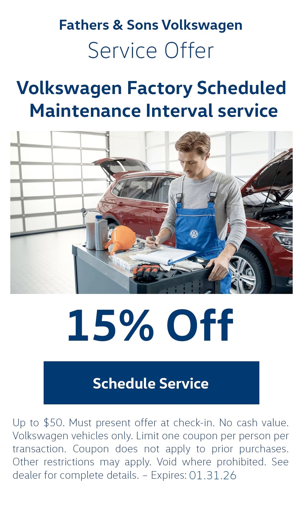 At Fathers and Sons Volkswagen, we understand that you want to keep your VW running like new. Our service and parts department are here for all of your maintenance needs - from oil changes and tire rotations to genuine VW parts for DIYers. Plus, you can even schedule your next service appointment or order parts online today. We promise a stress-free car buying experience and the highest customer satisfaction in the Northeast.