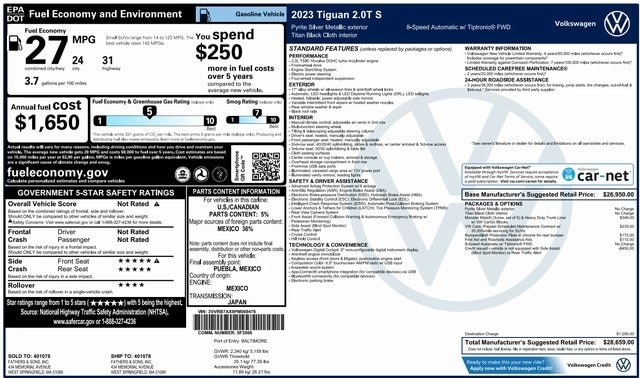 LOCATED AT 434 MEMORIAL AVE!! 74,000 MILE FACTORY WARRANTY!! CARFAX ONE OWNER!! LOCAL CLIENT TRADE-IN!! Complete Service Records, Factory Certified 2 years/24,000 miles Warranty Extension and Still Under Factory Warranty, Sold New Here, Local Client Trade in, Passed our Comprehensive Quality Inspection and Recently Serviced with Oil Change.**Price excludes, tax, title, and registration fees. Includes, $799 Dealer Documentation fee. CARFAX One-Owner. Certified. Silver Metallic 2023 Volkswagen Tiguan 2.0T S FWD/W 3RD ROW VW CERTIFIED FWD 8-Speed Automatic with Tiptronic 2.0L TSI DOHC **Price excludes, tax, title, and registration fees. Includes, $799 Dealer Documentation fee..