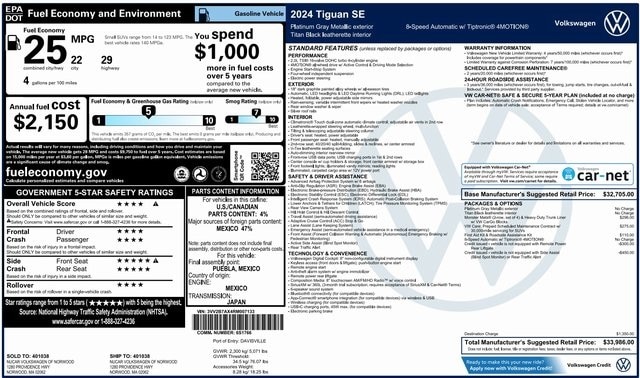 LOCATED AT 434 MEMORIAL AVE!! 50,000 MILE FACTORY WARRANTY!! LOCAL CLIENT TRADE-IN!! CARFAX ONE OWNER!! Passed our Comprehensive Quality Inspection and Recently Serviced with Oil Change.**Price excludes, tax, title, and registration fees. Includes, $799 Dealer Documentation fee. CARFAX One-Owner. Clean CARFAX. Platinum Gray Metallic 2024 Volkswagen Tiguan 2.0T SE AWD 8-Speed Automatic with Tiptronic 2.0L TSI DOHC **Price excludes, tax, title, and registration fees. Includes, $799 Dealer Documentation fee., AWD.
