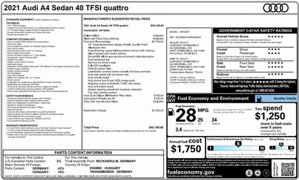 Convenience Package (Alarm System w/Motion Sensor, Audi Advanced Key, Audi Side Assist w/pre sense Rear, Heated Steering Wheel, Memory for Driver's Seat, Parking System Plus, and SiriusXM All Access Service), Premium Plus Package (2 Rear USB Charge Ports, Adaptive Cruise Control w/Traffic Jam Assist, Audi Active Lane Assist, Audi Phone Box, Audi Virtual Cockpit Plus, Hands-On Detection Steering Wheel, Leatherette Covered Center Console & Door Armrests, LED Headlights w/DRL Signature, Power Folding Exterior Mirrors, Top View Camera System, and Wheels: 18" 10-Spk-Dynamic Design Bi-Color Finish), 7-Speed Automatic S tronic, quattro, Black Leather, 10 Speakers, 17" Alloy wheels, 4-Wheel Disc Brakes, ABS brakes, Air Conditioning, AM/FM radio, Anti-whiplash front head restraints, Audi Guard All-Weather Floor Mats, Audi Guard Wheel Lock Kit, Audi smartphone interface (Apple CarPlay/Android Auto), Auto High-beam Headlights, Auto-dimming Rear-View mirror, Automatic temperature control, Brake assist, Bumpers: body-color, Compass, Delay-off headlights, Driver door bin, Driver vanity mirror, Dual front impact airbags, Dual front side impact airbags, Electronic Stability Control, Emergency communication system: Audi connect CARE, Exterior Parking Camera Rear, Four wheel independent suspension, Front anti-roll bar, Front Bucket Seats, Front Center Armrest, Front dual zone A/C, Front fog lights, Front reading lights, Garage door transmitter: HomeLink, Genuine wood dashboard insert, Genuine wood door panel insert, Gray Oak Natural Wood Inlays, Heated door mirrors, Heated Front Bucket Seats, Heated front seats, Illuminated entry, Knee airbag, Leather Seating Surfaces, Leather Shift Knob, Leather steering wheel, Low tire pressure warning, Occupant sensing airbag, Outside temperature display, Overhead airbag, Overhead console, Panic alarm, Passenger door bin, Passenger vanity mirror, Power door mirrors, Power driver seat, Power moonroof, Power passenger seat, Power steering, Power windows, Radio data system, Radio: Audi Sound System, Rain sensing wipers, Rear air conditioning, Rear anti-roll bar, Rear reading lights, Rear seat center armrest, Rear window defroster, Remote keyless entry, Speed control, Speed-sensing steering, Speed-Sensitive Wipers, Split folding rear seat, Steering wheel mounted audio controls, Tachometer, Telescoping steering wheel, Tilt steering wheel, Traction control, Trip computer, Turn signal indicator mirrors, Variably intermittent wipers, and Wheels: 17" 10-Spoke Design Forged.