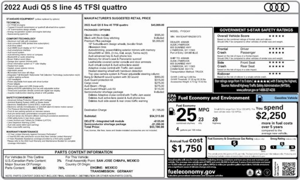 Black w/Leather Seating Surfaces, 17" Alloy wheels, ABS brakes, Compass, Electronic Stability Control, Front dual zone A/C, Heated door mirrors, Heated front seats, Illuminated entry, Low tire pressure warning, Power Liftgate, Remote keyless entry, Traction control, 10 Speakers, 4-Wheel Disc Brakes, 5.302 Axle Ratio, Air Conditioning, AM/FM radio, Auto High-beam Headlights, Auto-dimming Rear-View mirror, Automatic temperature control, Brake assist, Bumpers: body-color, Delay-off headlights, Driver door bin, Driver vanity mirror, Dual front impact airbags, Dual front side impact airbags, Emergency communication system: Audi connect CARE, Exterior Parking Camera Rear, Four wheel independent suspension, Front anti-roll bar, Front Bucket Seats, Front Center Armrest, Front fog lights, Front reading lights, Garage door transmitter: HomeLink, Genuine wood console insert, Genuine wood dashboard insert, Genuine wood door panel insert, Heated 8-Way Power Front Bucket Seats, Leather Seating Surfaces, Leather Shift Knob, Occupant sensing airbag, Outside temperature display, Overhead airbag, Overhead console, Panic alarm, Passenger door bin, Passenger vanity mirror, Power door mirrors, Power driver seat, Power passenger seat, Power steering, Power windows, Radio data system, Radio: Audi Sound System, Rain sensing wipers, Rear air conditioning, Rear anti-roll bar, Rear fog lights, Rear reading lights, Rear seat center armrest, Rear window defroster, Rear window wiper, Roof rack, Security system, Speed control, Speed-sensing steering, Speed-Sensitive Wipers, Split folding rear seat, Spoiler, Steering wheel mounted audio controls, Tachometer, Telescoping steering wheel, Tilt steering wheel, Trip computer, Turn signal indicator mirrors, Variably intermittent wipers, and Wheels: 18" 5-Arm-Star Design.