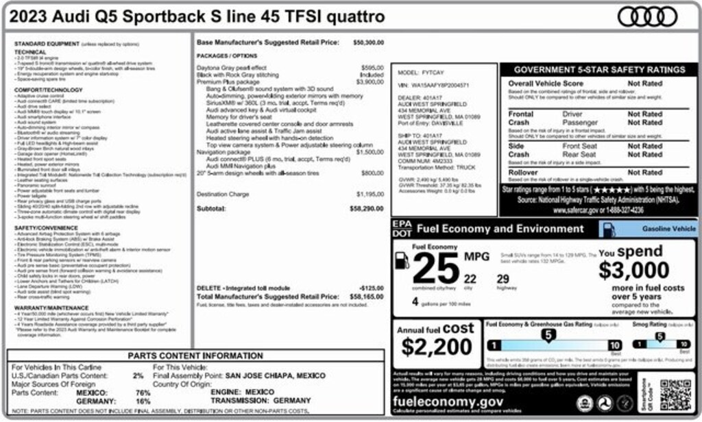 Convenience Package (Audi Advanced Key, Auto-Dimming Power Folding Exterior Mirrors, Driver Seat Memory, Heated Steering Wheel, and SiriusXM w/360L), Navigation Package (Audi Connect PLUS and MMI Navigation Plus), Premium Plus Package (Audi Active Lane Assist, Audi Virtual Cockpit Plus, Bang & Olufsen Sound System w/3D Sound, Hands-On Detection Steering Wheel, Leatherette Covered Center Console & Door Armrests, Power Adjustable Steering Column, Top View Camera System, and Traffic Jam Assist), Black Leather, 10 Speakers, 17" Alloy wheels, 4-Wheel Disc Brakes, ABS brakes, Air Conditioning, AM/FM radio, Auto High-beam Headlights, Auto-dimming Rear-View mirror, Automatic temperature control, Axle Ratio: TBD, Brake assist, Bumpers: body-color, Compass, Delay-off headlights, Driver door bin, Driver vanity mirror, Dual front impact airbags, Dual front side impact airbags, Electronic Stability Control, Emergency communication system: Audi connect CARE, Exterior Parking Camera Rear, Four wheel independent suspension, Front anti-roll bar, Front Bucket Seats, Front Center Armrest, Front dual zone A/C, Front fog lights, Front reading lights, Garage door transmitter: HomeLink, Genuine wood console insert, Genuine wood dashboard insert, Genuine wood door panel insert, Heated 8-Way Power Front Bucket Sport Seats, Heated door mirrors, Heated front seats, Illuminated entry, Integrated Toll Module Delete (DISC), Leather Seating Surfaces, Leather Shift Knob, Low tire pressure warning, Occupant sensing airbag, Outside temperature display, Overhead airbag, Overhead console, Panic alarm, Passenger door bin, Passenger vanity mirror, Power door mirrors, Power driver seat, Power Liftgate, Power moonroof: Panoramic, Power passenger seat, Power steering, Power windows, Radio data system, Radio: Audi Sound System, Rain sensing wipers, Rear air conditioning, Rear anti-roll bar, Rear fog lights, Rear reading lights, Rear seat center armrest, Rear window defroster, Rear window wiper, Remote keyless entry, Security system, Speed control, Speed-sensing steering, Speed-Sensitive Wipers, Split folding rear seat, Spoiler, Steering wheel mounted audio controls, Tachometer, Telescoping steering wheel, Tilt steering wheel, Traction control, Trip computer, Turn signal indicator mirrors, Variably intermittent wipers, Wheels: 19" 5-Double-Arm Design Bi-Color Finish, and Wheels: 20" 5-Arm Design.