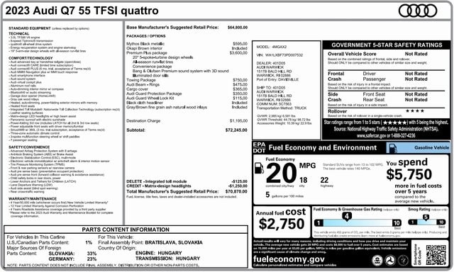 LOCATED AT 434 MEMORIAL AVE!! 50,000 MILE FACTORY WARRANTY!! LOCAL CLIENT TRADE-IN!! Passed our Comprehensive Quality Inspection and Recently Serviced with Oil Change.**Price excludes, tax, title, and registration fees. Includes, $799 Dealer Documentation fee. CARFAX One-Owner. Mythos Black Metallic 2023 Audi Q7 55 Premium Plus quattro quattro 8-Speed Automatic with Tiptronic 3.0L TFSI 17" Alloy wheels, ABS brakes, Compass, Electronic Stability Control, Front dual zone A/C, Heated door mirrors, Heated Front Bucket Seats, Heated front seats, Illuminated entry, Low tire pressure warning, Power Liftgate, Remote keyless entry, Traction control.
