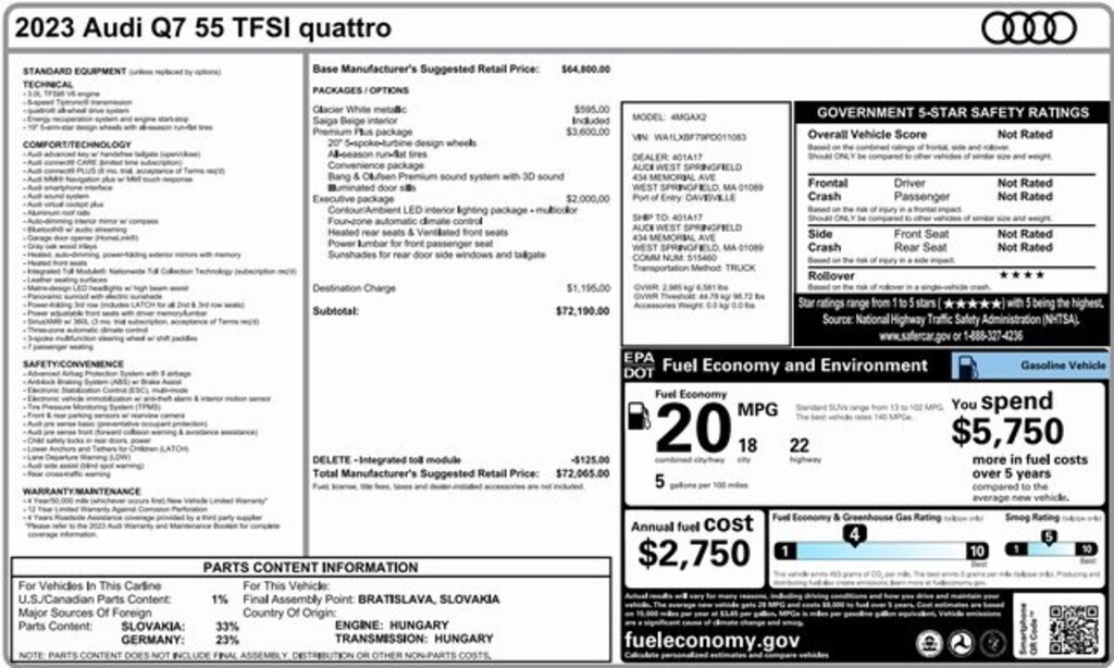 LOCATED AT 434 MEMORIAL AVE!! 50,000 MILE FACTORY WARRANTY!! CARFAX ONE OWNER!! LOCAL CLIENT TRADE-IN!! Complete Service Records, Sold New Here, Still Under Factory Warranty, Local Client Trade in on New Audi, Excellent Condition Both Inside and Out, Passed our Comprehensive Quality Inspection and Recently Serviced with Oil Change.**Price excludes, tax, title, and registration fees. Includes, $699 Dealer Documentation fee. CARFAX One-Owner. Clean CARFAX. Glacier White 2023 Audi Q7 55 Premium Plus quattro quattro 8-Speed Automatic with Tiptronic 3.0L TFSI **Price excludes, tax, title, and registration fees. Includes, $699 Dealer Documentation fee..
