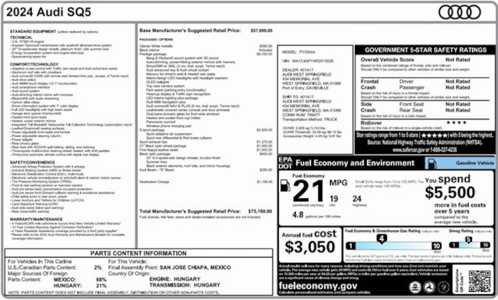 LOCATED AT 434 MEMORIAL AVE!! 21" BLACK OPTIC PACKAGE!! PRESTIGE PACKAGE!! CARFAX ONE OWNER!! Excellent Condition Both Inside and Out, Passed our Comprehensive Quality Inspection and Recently Serviced with Oil Change.**Price excludes, tax, title, and registration fees. Includes, $699 Dealer Documentation fee. CARFAX One-Owner. Clean CARFAX. Glacier White Metallic 2024 Audi SQ5 Prestige quattro quattro 8-Speed Automatic with Tiptronic 3.0L TFSI **Price excludes, tax, title, and registration fees. Includes, $699 Dealer Documentation fee..