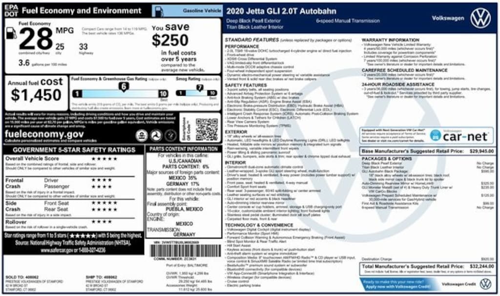 LOCATED AT 434 MEMORIAL AVE!! LOCAL CLIENT TRADE-IN!! AUTOBAHN BLACK PACKAGE!! Passed our Comprehensive Quality Inspection and Recently Serviced with Oil Change. Clean CARFAX. Deep Black Pearl 2020 Volkswagen Jetta GLI 2.0T Autobahn MANUAL FWD 6-Speed Manual 2.0L TSI 17" Alloy wheels, ABS brakes, Electronic Stability Control, Front dual zone A/C, Heated door mirrors, Heated front seats, Illuminated entry, Low tire pressure warning, Power moonroof, Remote keyless entry, Traction control.