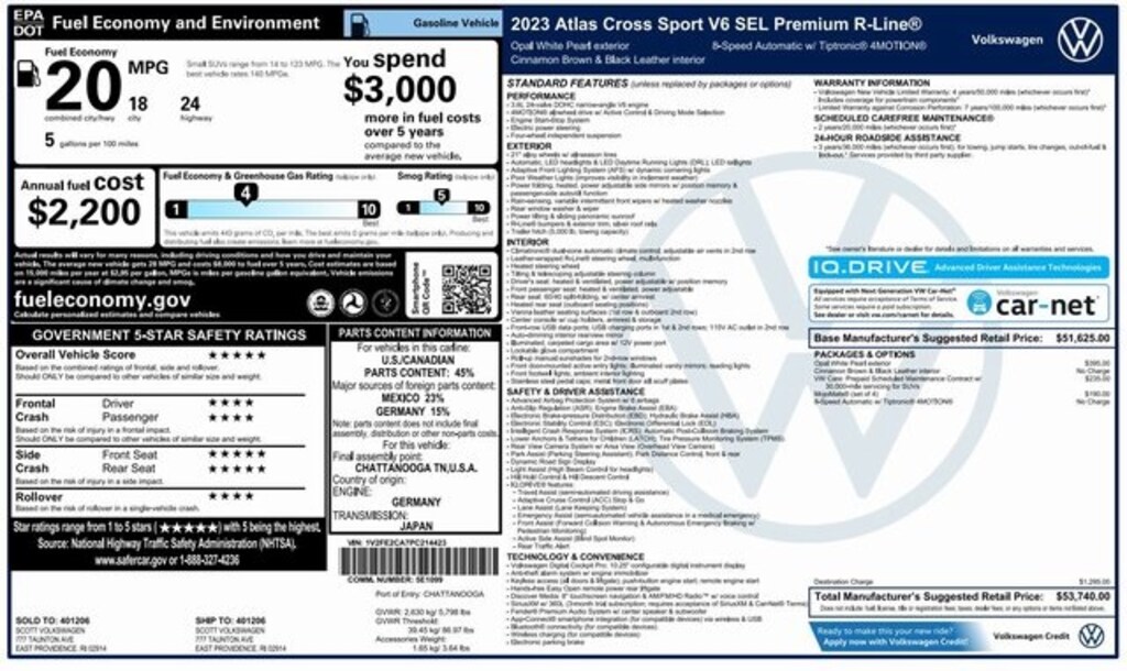 12 Speakers, 17" Alloy wheels, 3.60 Axle Ratio, 4-Wheel Disc Brakes, ABS brakes, Air Conditioning, AM/FM radio: SiriusXM with 360L, Auto High-beam Headlights, Auto-dimming Rear-View mirror, Automatic temperature control, Brake assist, Bumpers: body-color, Compass, Delay-off headlights, Driver door bin, Driver vanity mirror, Dual front impact airbags, Dual front side impact airbags, Electronic Stability Control, Emergency communication system: VW Car-Net Safe & Secure 5-year, Four wheel independent suspension, Front anti-roll bar, Front Bucket Seats, Front Center Armrest, Front dual zone A/C, Front fog lights, Front reading lights, Fully automatic headlights, Heated & Ventilated Front Comfort Sport Seats, Heated door mirrors, Heated front seats, Heated rear seats, Heated steering wheel, Illuminated entry, Leather Shift Knob, Low tire pressure warning, Memory seat, Navigation System, Occupant sensing airbag, Outside temperature display, Overhead airbag, Overhead console, Panic alarm, Passenger door bin, Passenger vanity mirror, Perforated Vienna Leather Seating Surfaces, Power door mirrors, Power driver seat, Power Liftgate, Power moonroof: Panoramic, Power passenger seat, Power steering, Power windows, Radio data system, Radio: MIB3 Discover Media w/8" Touchscreen Navigation, Rain sensing wipers, Rear anti-roll bar, Rear reading lights, Rear seat center armrest, Rear window defroster, Rear window wiper, Remote keyless entry, Security system, Speed control, Speed-sensing steering, Split folding rear seat, Spoiler, Sport steering wheel, Standard Suspension, Steering wheel mounted audio controls, Tachometer, Telescoping steering wheel, Tilt steering wheel, Traction control, Trip computer, Turn signal indicator mirrors, Variably intermittent wipers, Ventilated front seats, and Wheels: 21" 2-Tone Machined Alloy.