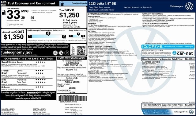 LOCATED AT 434 MEMORIAL AVE!! Carfax One Owner, Complete Service Records, Sold New Here, Still Under Factory Warranty, Local Client Trade in on New VW, Excellent Condition Both Inside and Out, Passed our Comprehensive Quality Inspection and Recently Serviced with Oil Change.**Price excludes, tax, title, and registration fees. Includes, $799 Dealer Documentation fee. CARFAX One-Owner. Clean CARFAX. Deep Black 2023 Volkswagen Jetta 1.5T SE FWD 8-Speed Automatic with Tiptronic 1.5L I-4 DI DOHC Turbocharged **Price excludes, tax, title, and registration fees. Includes, $799 Dealer Documentation fee., Titan Black Premium Synthetic.