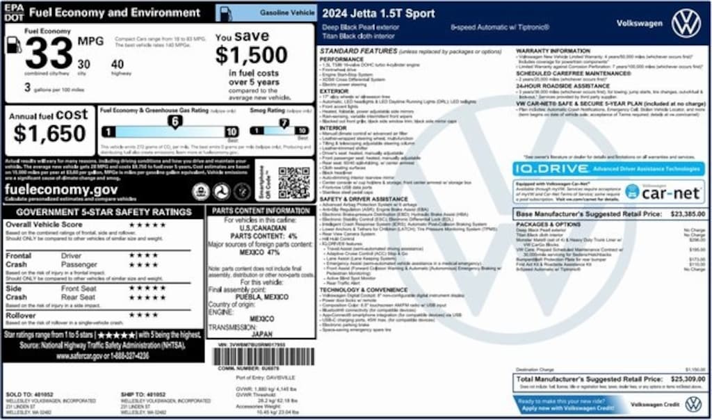 LOCATED AT 434 MEMORIAL AVE!! 50,000 MILE FACTORY WARRANTY!! LOCAL CLIENT TRADE-IN!! CARFAX ONE OWNER!! GREAT SERVICE HISTORY!! Local Client Trade in, Excellent Condition Both Inside and Out, Passed our Comprehensive Quality Inspection and Recently Serviced with Oil Change.**Price excludes, tax, title, and registration fees. Includes, $699 Dealer Documentation fee. CARFAX One-Owner. Clean CARFAX. Deep Black Pearl 2024 Volkswagen Jetta 1.5T Sport FWD 8-Speed Automatic with Tiptronic 1.5L I-4 DI DOHC Turbocharged **Price excludes, tax, title, and registration fees. Includes, $699 Dealer Documentation fee., Titan Black w/Cloth Seat Trim.