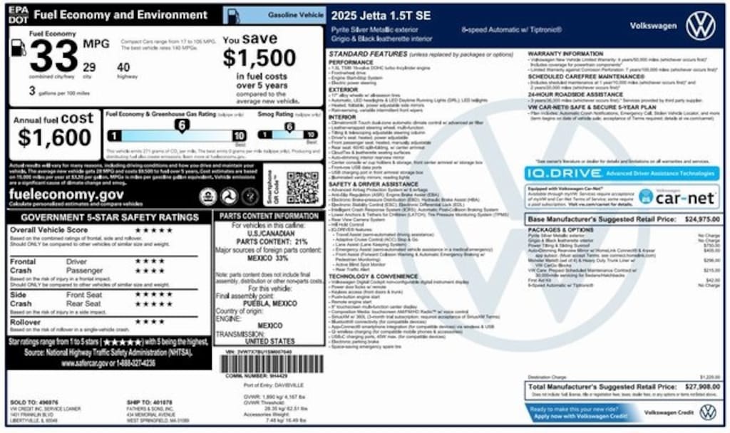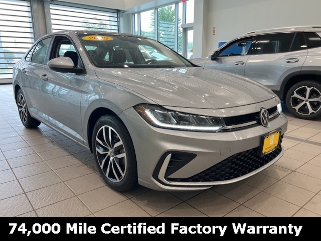 LOCATED AT 434 MEMORIAL AVE!! 74,000 MILE FACTORY WARRANTY!! CARFAX ONE OWNER!! SOLD HERE NEW!! Factory Certified 2 years/24,000 miles Warranty Extension and Still Under Factory Warranty, Sold New Here, Local Client Trade in, Passed our Comprehensive Quality Inspection and Recently Serviced with Oil Change. CARFAX One-Owner. Clean CARFAX. Pyrite Silver Metallic 2025 Volkswagen Jetta 1.5T SE FWD 8-Speed Automatic with Tiptronic 1.5L I-4 DI DOHC Turbocharged Grigio/Titan Black w/CloudTex & V-Tex Leatherette Seat Trim.