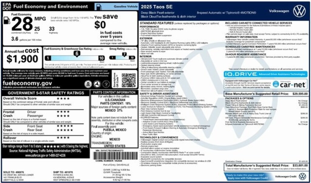 Panoramic Sunroof Package, Taos Adventure Package (SXB) (Black Bumperdillo Protection Plate for Rear Bumper, Retractable Privacy Cover for Cargo Area Blocks, Roof Rack Base Carrier Bars (Set of 2), and Wheel Splash Guards (Set of 4)), 17" Alloy wheels, 4-Wheel Disc Brakes, 6 Speakers, ABS brakes, Active Blind Spot Monitor, Air Conditioning, AM/FM radio: SiriusXM with 360L, Auto High-beam Headlights, Automatic temperature control, Brake assist, Bumpers: body-color, CloudTex & Cloth Seating Surfaces, Compass, Delay-off headlights, Driver door bin, Driver vanity mirror, Dual front impact airbags, Dual front side impact airbags, Electronic Stability Control, Emergency communication system: VW Car-Net Safe & Secure 5-year, Exterior Parking Camera Rear, First Aid Kit, Four wheel independent suspension, Front anti-roll bar, Front Bucket Seats, Front Center Armrest, Front dual zone A/C, Front reading lights, Front Strut Rear Multi-Link Suspension, Fully automatic headlights, Heated door mirrors, Heated Front Bucket Seats, Heated front seats, Heated steering wheel, Illuminated entry, Leather Shift Knob, Low tire pressure warning, Occupant sensing airbag, Outside temperature display, Overhead airbag, Overhead console, Panic alarm, Passenger door bin, Passenger vanity mirror, Power door mirrors, Power driver seat, Power steering, Power windows, Radio data system, Radio: MIB3 Composition Media AM/FM/HD, Rain sensing wipers, Rear anti-roll bar, Rear seat center armrest, Rear window defroster, Rear window wiper, Remote keyless entry, Roadside Assistance Kit, Rubber Mats Kit, Security system, Speed control, Speed-sensing steering, Split folding rear seat, Spoiler, Steering wheel mounted audio controls, Tachometer, Telescoping steering wheel, Tilt steering wheel, Traction control, Trip computer, Variably intermittent wipers, VW Care, and Wheels: 18" 2-Tone Machined Alloy.
