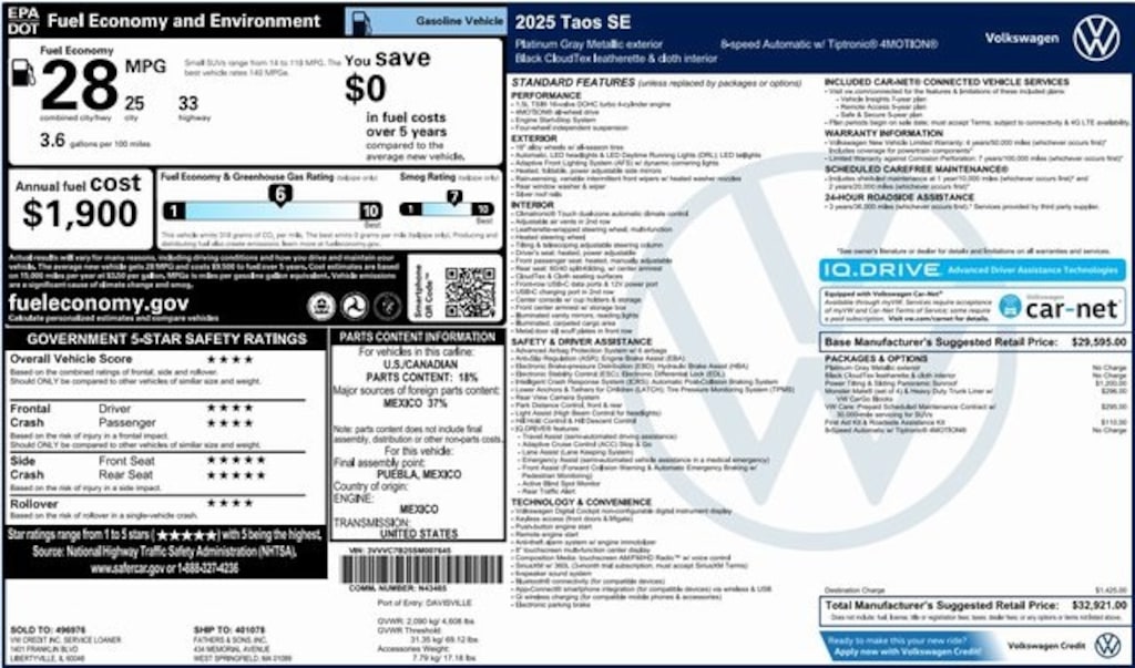 LOCATED AT 434 MEMORIAL AVE!! 74,000 MILE FACTORY WARRANTY!! SOLD HERE NEW!! LOCAL CLIENT TRADE-IN!! Factory Certified 2 years/24,000 miles Warranty Extension and Still Under Factory Warranty, Sold New Here, Local Client Trade in, Passed our Comprehensive Quality Inspection and Recently Serviced with Oil Change.**Price excludes, tax, title, and registration fees. Includes, $699 Dealer Documentation fee. New Price! CARFAX One-Owner. Clean CARFAX. Platinum Grey 2025 Volkswagen Taos 1.5T SE AWD 8-Speed Automatic with Tiptronic 1.5L I4 Turbocharged DOHC 16V LEV3-SULEV30 174hp **Price excludes, tax, title, and registration fees. Includes, $699 Dealer Documentation fee..