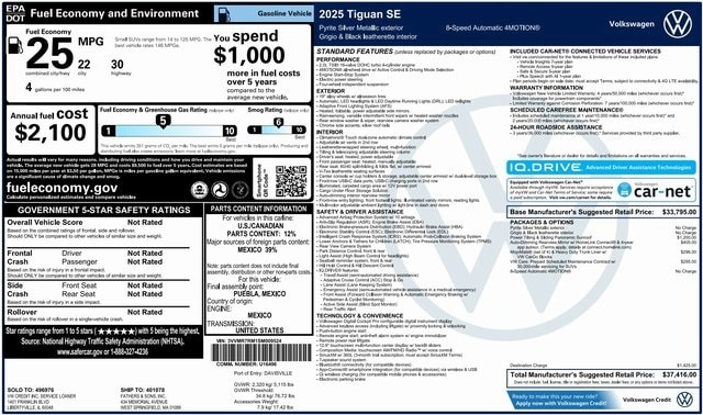 LOCATED AT 434 MEMORIAL AVE!! 70,000 MILE FACTORY CERTIFIED WARRANTY!! Carfax One Owner, Complete Service Records, 1 Year/ 20,000 Mile Factory Certified Warranty Extension and Still Under Factory Warranty, Sold New Here, Local Client Trade in, Passed our Comprehensive Quality Inspection and Recently Serviced with Oil Change. Audi Certified Pre-Owned, which is ONLY available through authorized Audi dealers, means you not only get the reassurance of up to a 1 year/ 20,000 mile limited warranty (from original date of sale), but also a 300+point inspection/reconditioning, 24/7 roadside assistance, trip-interruption services, complimentary service loaner, and a complete CARFAX vehicle history report.**Price excludes, tax, title, and registration fees. Includes, $799 Dealer Documentation fee. CARFAX One-Owner. Clean CARFAX. Certified. Silver Metallic 2025 Volkswagen Tiguan 2.0T SE 4 Motion VW Certified AWD 8-Speed Automatic 2.0L TSI DOHC **Price excludes, tax, title, and registration fees. Includes, $799 Dealer Documentation fee., AWD.